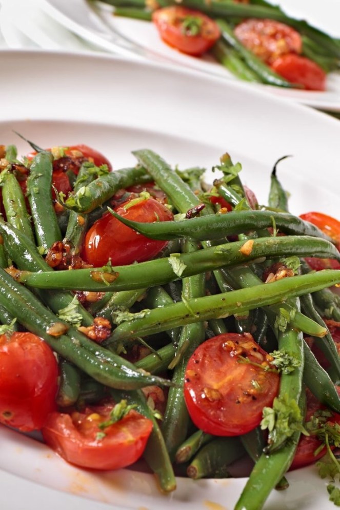 When the green beans are finished, remove them from the oven, add tomato mixture to pan, and gently mix until thoroughly combined.